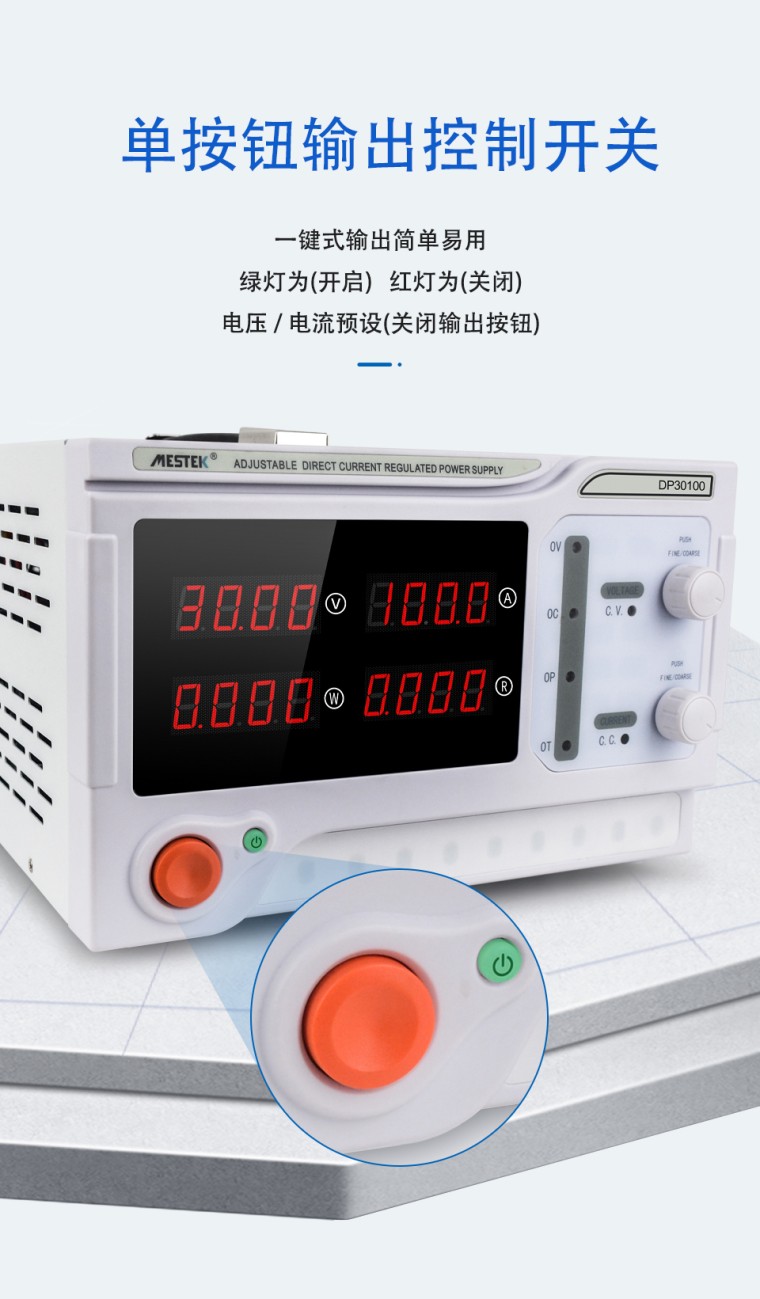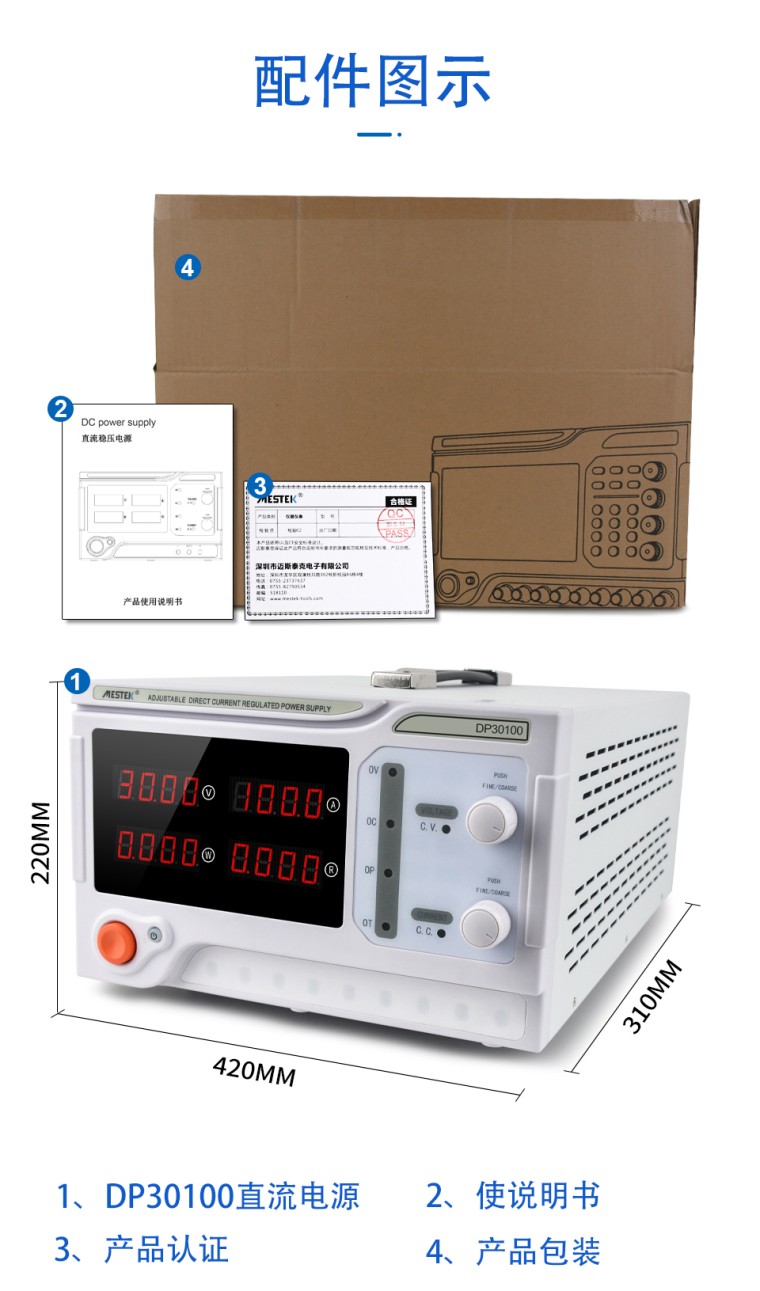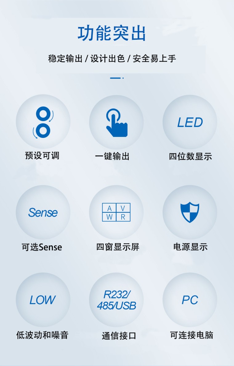 产品介绍 1、彩色四位数显示 2、高功率输出3000W 3、输出电压/电流:0-100V/0-10A 4、电源电压:AC220V/AV110V可选 5、电压分辨率:<100v:10>100V:0.1V- 6、电流分辨率:<10a:1>10A:10 mA 7、功率分辨率:<10w:1mw,>10W:10mW/2100W:0.1W/21000 8、电压/电流/负载/波动精度:<2%/<0.5%/≤0.5%/1 9、电压/电流步数调整分辨率:0.1V/0.1A 10、电压/电流波纹:≤20mV RMS/≤100mA RMS 11、产品尺寸/重量:330(长)*250(宽)*155(高)mm / 约5kg 卖点: 1、整体输出保护 2、前后输出端口。 3、感应补偿输出接口可选:USB/485/232 4、恒压/恒流自动切换 5、步数可调,编码开关 ![]() ![]() ![]() ![]() ![]() |