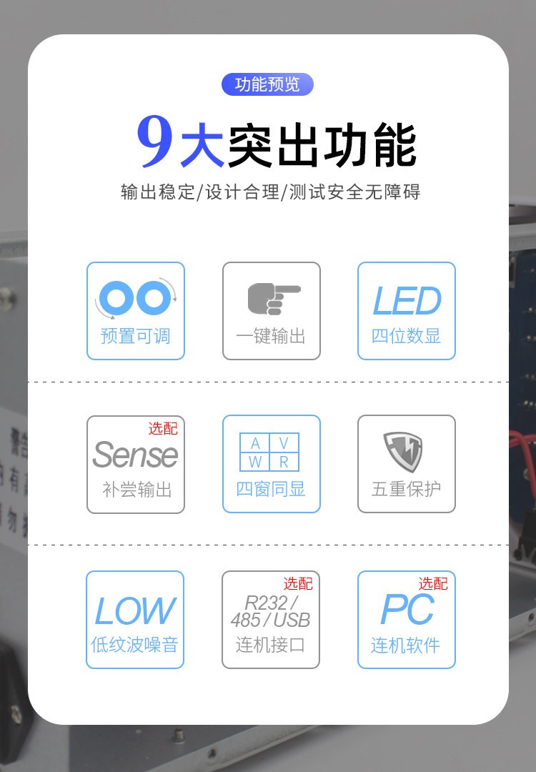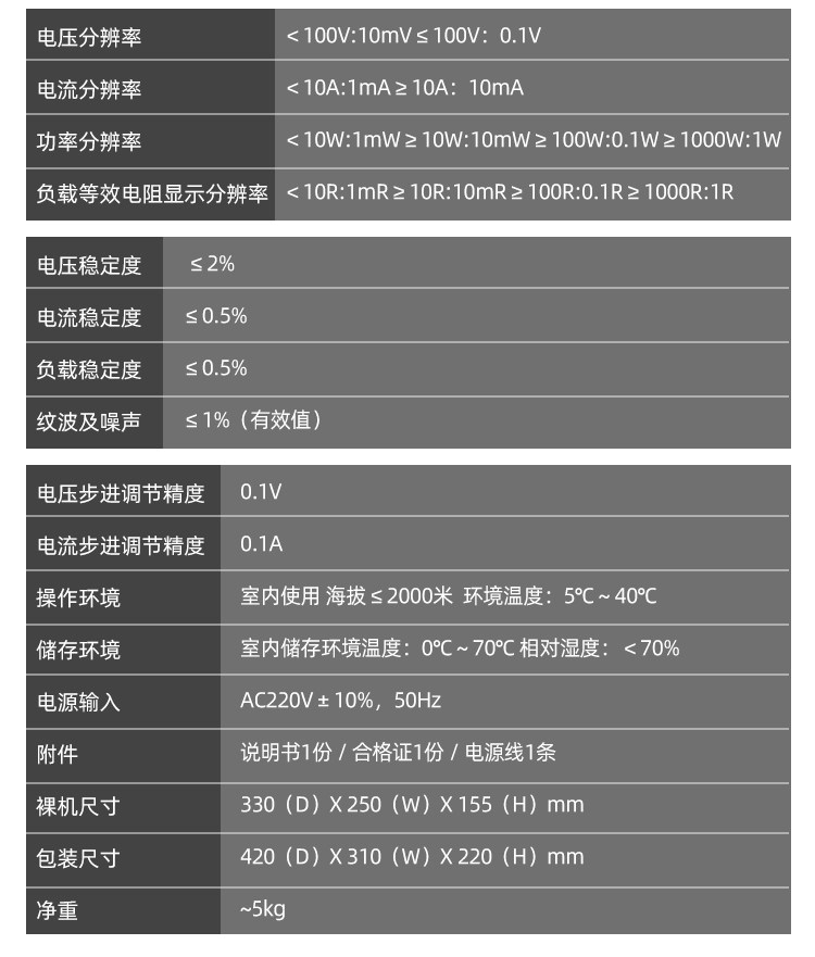 产品介绍 1、彩色四位数显示 2、900W大功率输出 3、输出功率/电压/电流:900W/0-30V/0-20A 4、电源电压:AC220V/AV110V可选 5、电压分辨率:<100V:10 mV,≥100V:0.1V- 6、电流分辨率:<10A:1 mA,≥10A:10 mA 7、功率分辨率:<10W:1mW,≥10W:10mW/2100W:0.1W/21000W:1W 8、电压/电流/负载/波动精度:<2%/≤0.5%/≤0.5%/1 9、电压/电流阶梯调整分辨率:0.1V/0.1A 10、电压/电流波动:≤20mV RMS/≤100mA RMS 11、产品尺寸/重量:330(长)*250(宽)*155(高)mm / 约5kg 卖点:1、感应补偿输出接口可选:USB/485/232 2、恒压/恒流自动切换 3、步数可调,编码开关