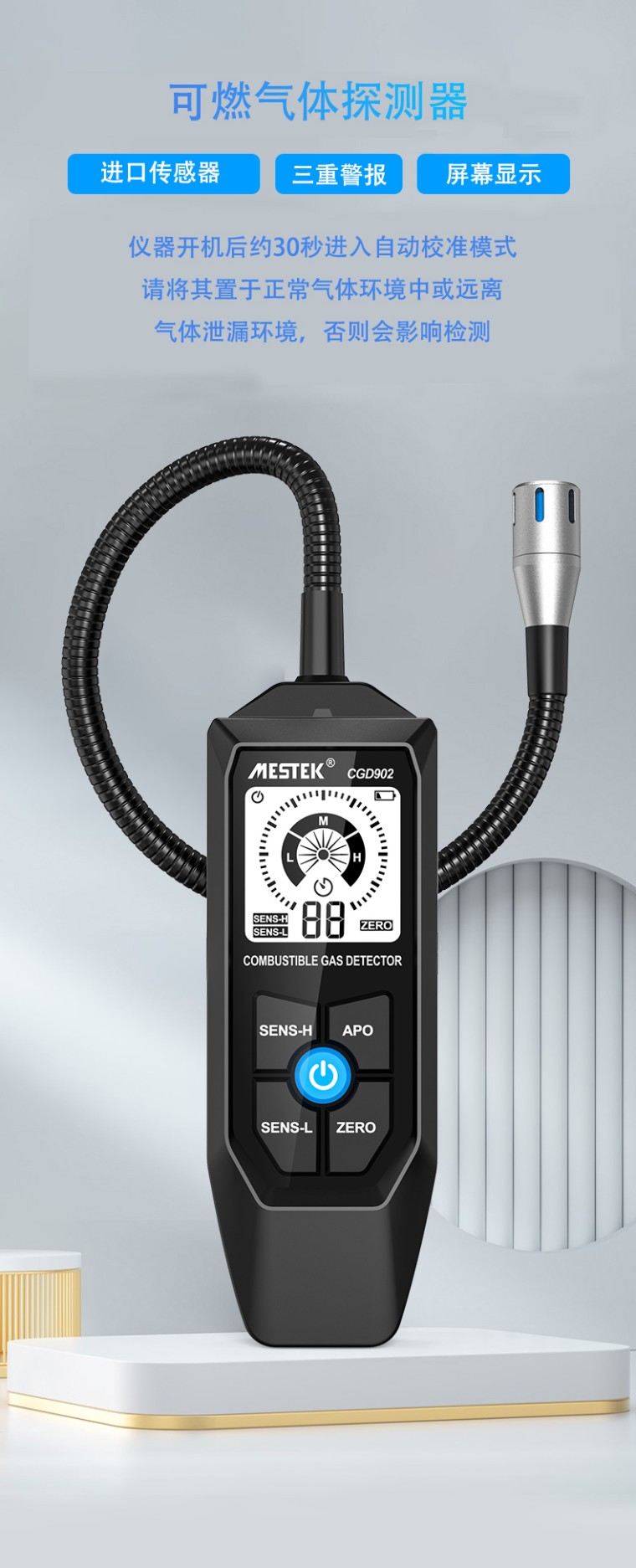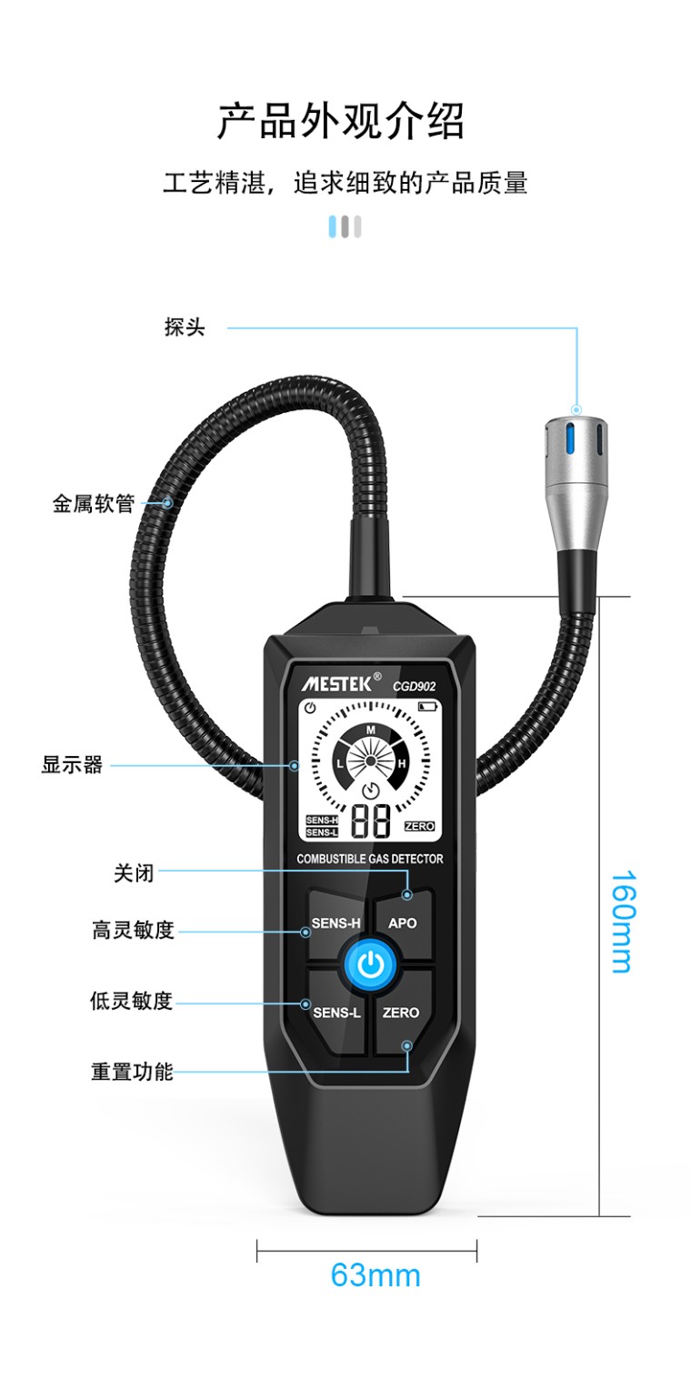 产品介绍 1、可弯曲探头设计 2、声音屏幕警告 3、测量方法:扩散 4、高灵敏度测量范围:50~10000ppm 5、低灵敏度测量范围:500~10000ppm 6、金属软管长度:大约457.2毫米 7、可测自然气体、煤气、液化天然气 8、2秒响应速度 9、开机30秒自动校准 10、普通模拟显示屏 11、10分钟无操作自动关机 ![]() ![]() ![]() ![]() ![]() |