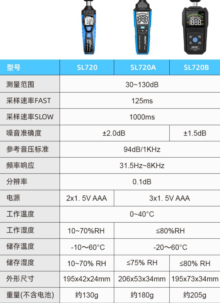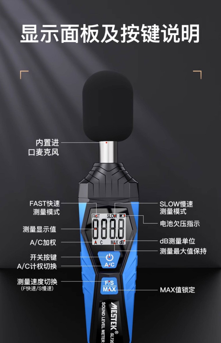 产品介绍 1、30~130分贝测量范围 2、A & C 频率加权 3、快 & 慢 时间加权 4、LCD 4位数显示屏幕 5、最大保持功能 6、±2%精确度 7、31.5Hz~8kHz频率 8、动态开关:125ms为快,100ms为慢