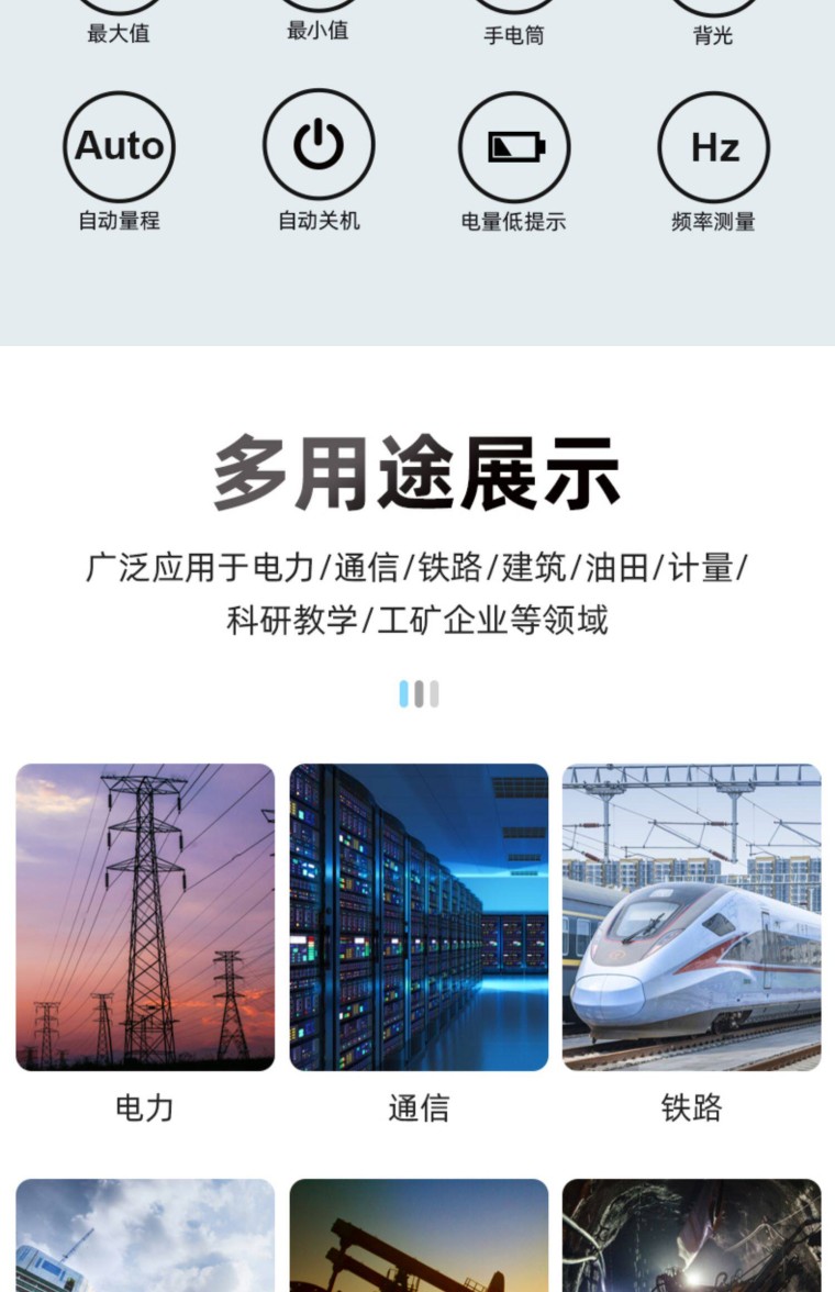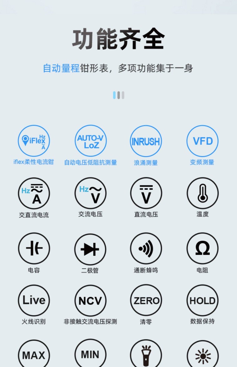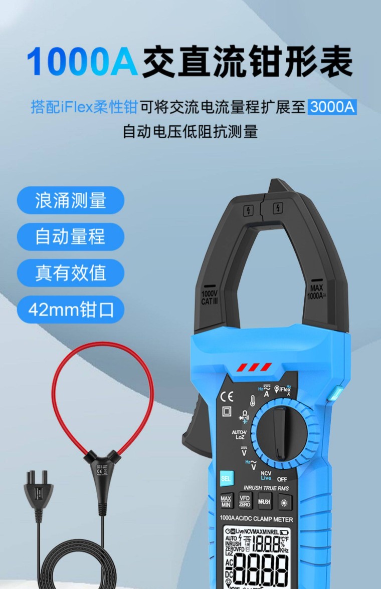 产品介绍 1、6000计数 1000A 2、电阻/电容测量 3、柔性钳设计 4、通断蜂鸣 5、NCV非接触式电压探测 6、屏幕背光/钳口照明 7、数据保持 8、T-Rms真有效值 9、K类型温度测试 10、VFD功能 11、1000A涌浪电流