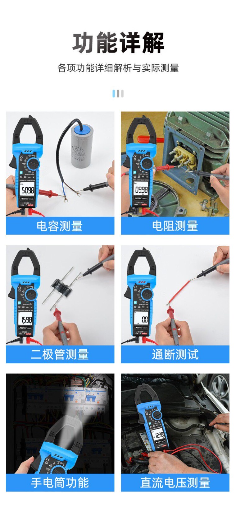 产品介绍 1、600A交流电流 2、电阻测量(0-100MΩ) 3、通断蜂鸣/二极管 4、600V交直流电压 5、电容/电阻测量 6、NCV非接触式电压探测 7、钳头照明/屏幕背光 8、数据保持 9、T-Rms真有效值 10、自动低阻抗电压探测 11、RCD漏电保护测试 12、VFD变频电流测量 13、℃/°F温度测试单位转换 ![]() ![]() |