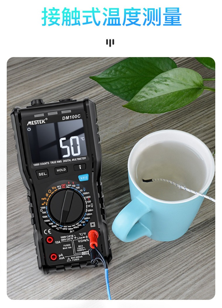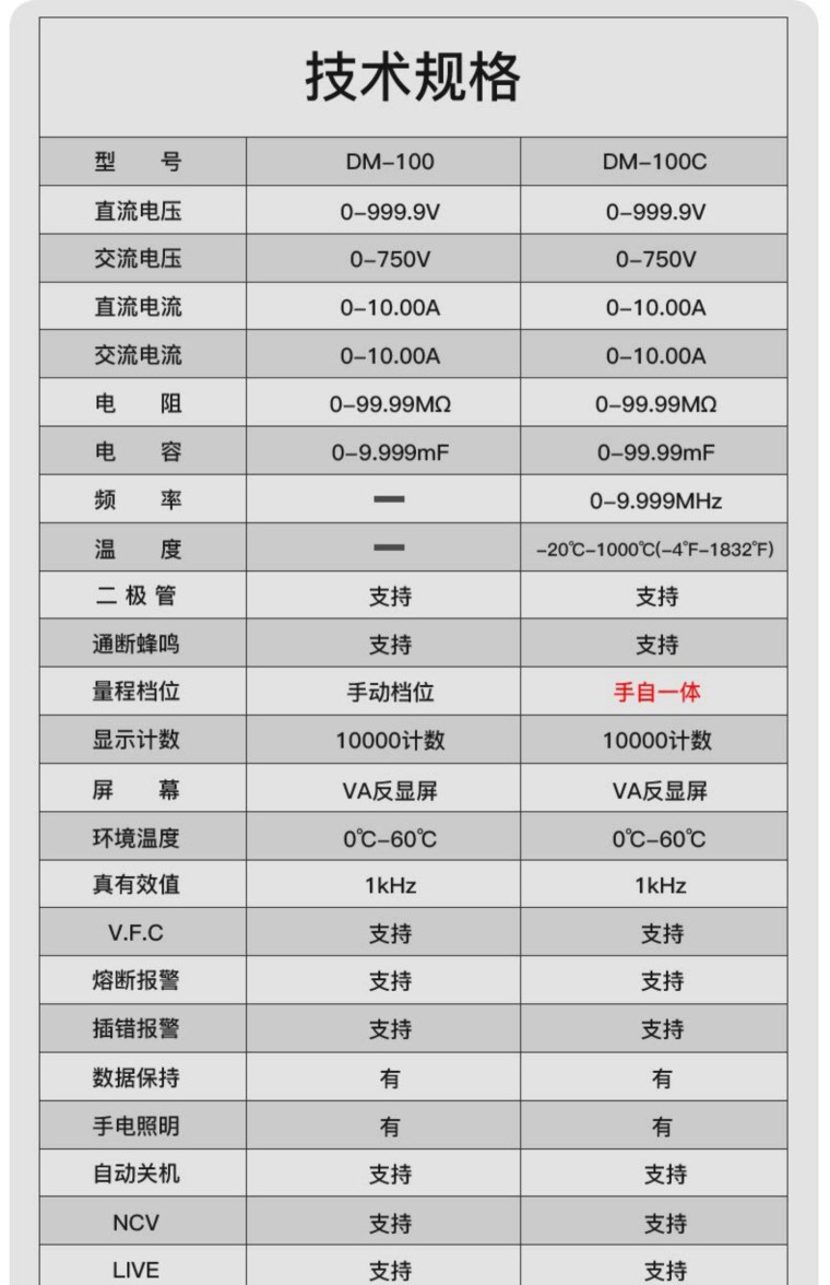 产品介绍 1、10000计数 手动、自动量程一体设计 2、智能双芯片 数模双显 3、熔断报警 错插报警 4、零线/火线区分 5、二极管/通断档测试 6、交流电压电流频率测试 7、1kHz真有效值测量 8、VFC变频电压测量 9、NCV非接触式探测电压 10、温度档可测环境温度