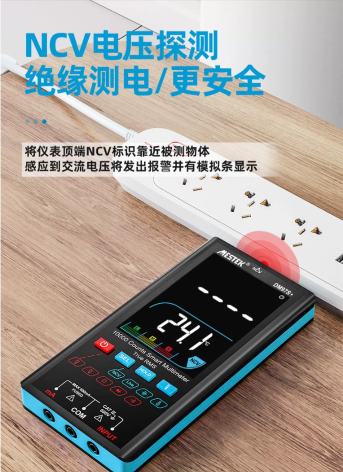 产品介绍 1、10000计数 智能档位 全档防烧 2、NCV非接触式电压探测 3、交直流电压测试 4、电阻/电容高速测试 5、二极管测试 6、连续性测试(声光警告) 7、零线/火线区分 8、Ture-Rms 真有效值 9、数据保持 10、温度单位切换℃/°F 11、背光高清显示/手电筒照明 12、可选配强磁吸挂带