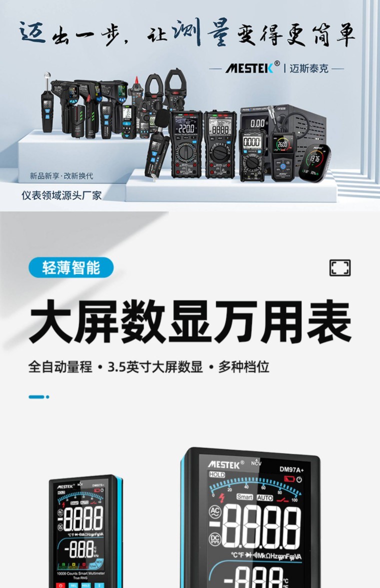 产品介绍 1、10000计数 手动量程 2、NCV非接触式电压探测 3、交直流电压测试 4、电阻/电容高速测试 5、二极管测试 6、连续性测试(声光警告) 7、零线/火线区分 8、Ture-Rms 真有效值 9、数据保持 10、温度单位切换℃/°F 11、背光高清显示/手电筒照明 12、可选配强磁吸挂带