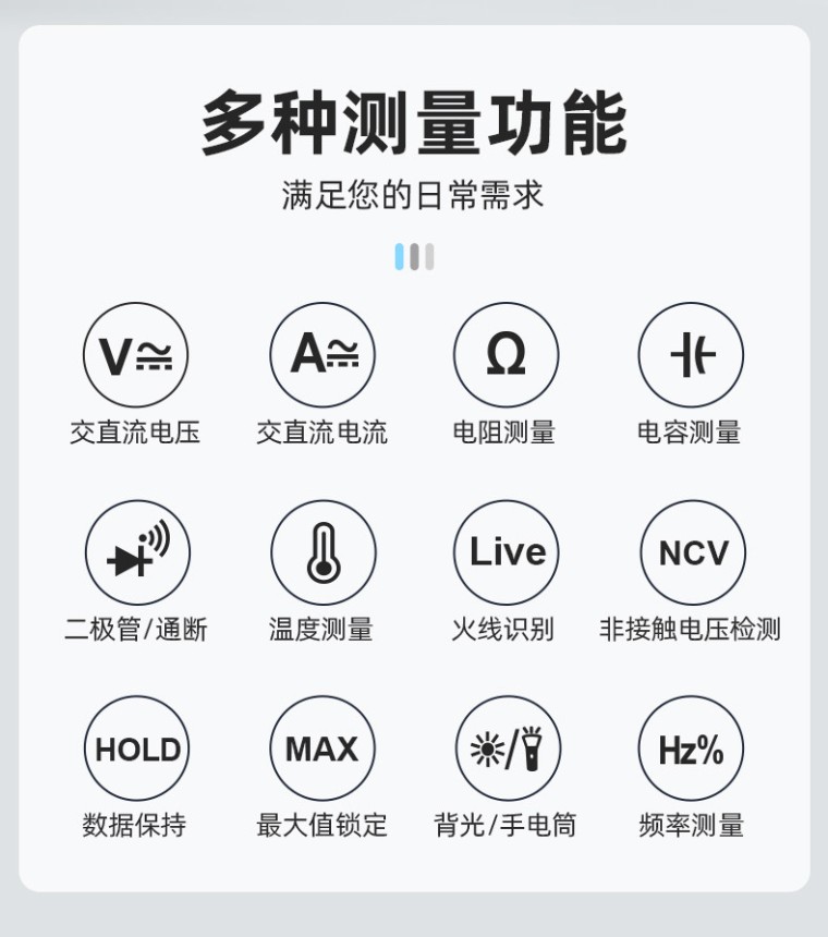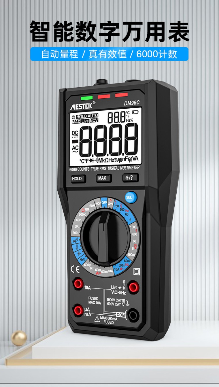 产品介绍 1、6000计数 手动量程 2、NCV非接触式电压探测 3、交直流电压测试 4、电阻/电容高速测试 5、二极管测试 6、连续性测试(声光警告) 7、零线/火线区分 8、Ture-Rms 真有效值 9、数据保持 10、温度单位切换℃/°F 11、背光高清显示/手电筒照明 12、可选配强磁吸挂带 ![]() ![]() |