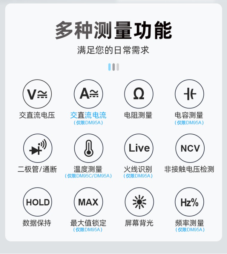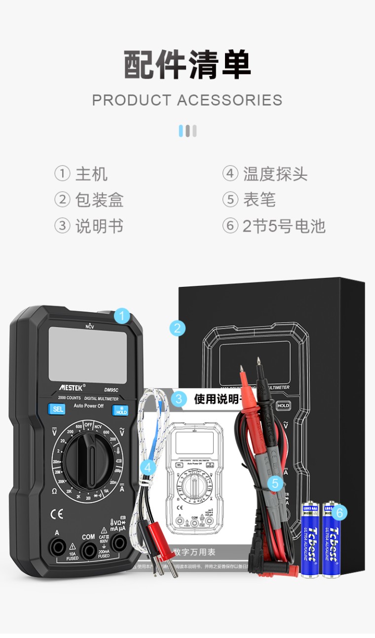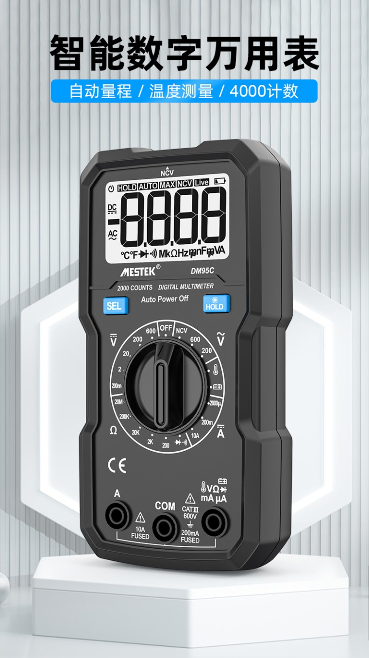 产品介绍 1、2000计数 手动量程 2、NCV非接触式电压探测 3、交直流电压测试4、电阻高速测试 5、二极管/连续性测试 6、数据保持 7、温度单位切换°C/°F 8、背光高清显示/手电筒照明 9、可选配强磁吸挂带![]() ![]() ![]() |