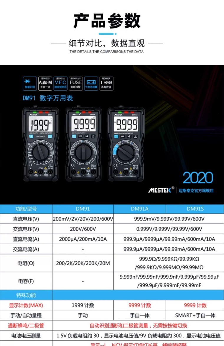 产品介绍 1、2000计数 手动量程 2、NCV非接触式电压探测 3、交直流电压测试4、电阻高速测试 5、频率测试 5、二极管/连续性测试 6、1.5V/9V电池测试 7、数据保持 8、背光高清显示/手电筒照明 9、可选配强磁吸挂带